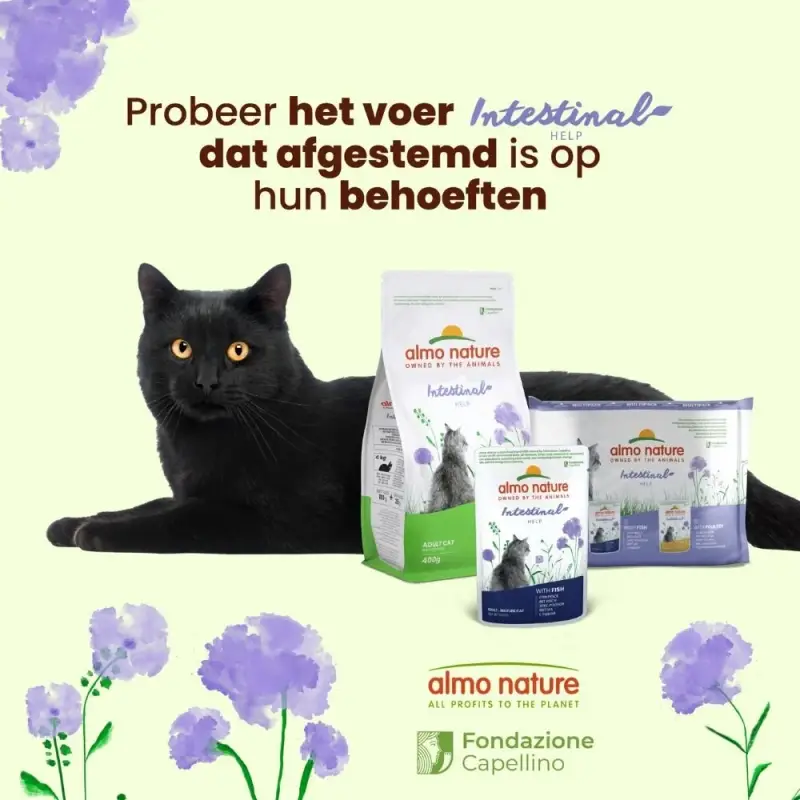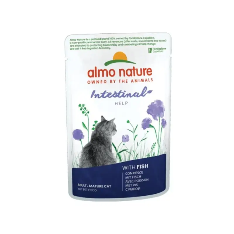 Almo Nature adviseert dagelijks 60% natvoer en 40% droogvoer te geven. Deze natvoedingslijn kan worden aangevuld met de Intestinal droogvoedingslijn. De brokken van Almo Nature Intestinal Help zijn gemaakt met 26% vers vlees of vis om de vetvrije massa te ondersteunen en zeer goed verteerbaar eiwit te bieden. Ze bevatten prebiotica zoals inuline om het evenwicht van de microbiota en het algemene welzijn van je kat te ondersteunen.